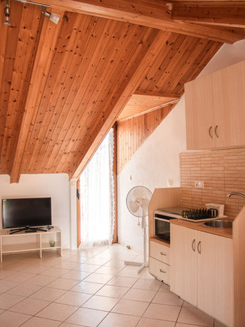 Αυτό το ευρύχωρο στούντιο (40 τ.μ.) βρίσκεται στο ισόγειο του συγκροτήματος μας. Διαθέτει ξεχωριστή είσοδο και ιδιωτικό κήπο. Μπορεί να φιλοξενήσει άνετα μια τετραμελή οικογένεια, με δυνατότητα προσθήκης επιπλέον κρεβατιού για ένα πέμπτο μέλος. Η αυλή είναι πλήρως εξοπλισμένη με τραπέζι, καρέκλες και απλώστρα ρούχων.