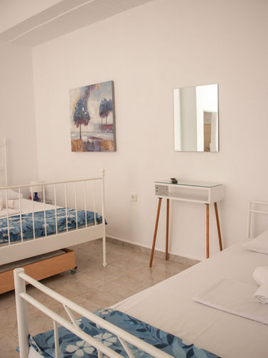 This spacious family-friendly studio spanning (40 sq.m) is nestled on the ground floor of our complex. Boasting its separate entrance and a private courtyard garden, it offers ample space to comfortably accommodate a family of four, with the option to add an extra bed for a fifth member. The courtyard is fully furnished with a table, chairs, and clothes hangers, providing a cozy outdoor retreat. Surrounded by a lush garden, the studio remains refreshingly cool during the summer months, ensuring a tranquil and relaxing stay for guests.